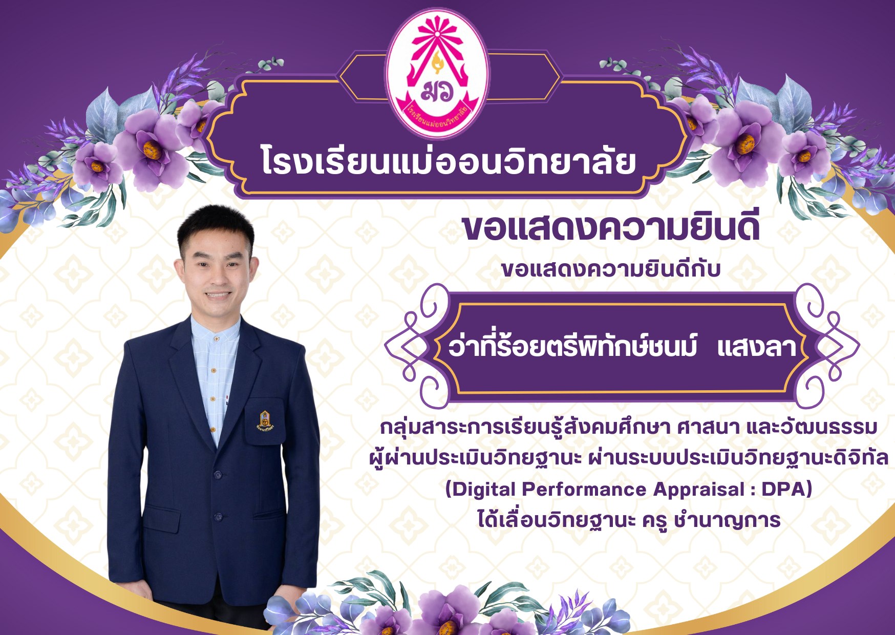 โรงเรียนแม่ออนวิทยาลัย ขอแสดงความยินดีกับ ว่าที่ร้อยตรีพิทักษ์ชนม์ แสงลา กลุ่มสาระการเรียนรู้สังคมศึกษา ศาสนา และวัฒนธรรม ผู้ผ่านการประเมินวิทยฐานะ ผ่านระบบประเมินวิทยฐานะดิจิทัล (Digital Performance Appraisal : DPA) ได้เลื่อนวิทยฐานะ ครู ชำนาญการ