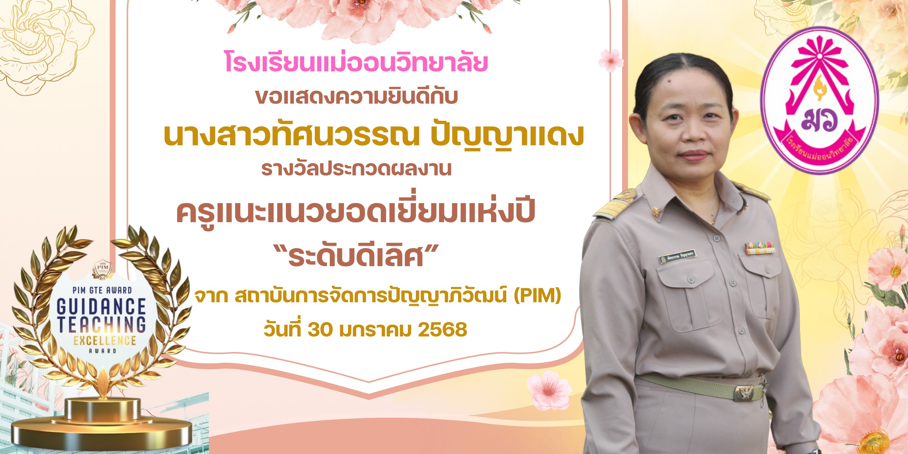 วันที่ 30 มกราคม 2568 โรงเรียนแม่ออนวิทยาลัย ของแสดงความยินดีกับนางสาวทัศนวรรณ ปัญญาแดง รับรางวัลประกวด “ครูแนะแนวยอดเยี่ยมแห่งปี” PIM GTE AWARD: Guidance Teaching Excellence Award "ระดับดีเลิศ" จากสถาบันการจัดการปัญญาภิวัฒน์ (PIM) และเข้ารับโล่ประกาศเกียรติคุณ เข็มเชิดชูเกียรติ และเกียรติบัตร วันเสาร์ที่ 1 มีนาคม 2568 ณ สถาบันการจัดการปัญญาภิวัฒน์ (PIM)