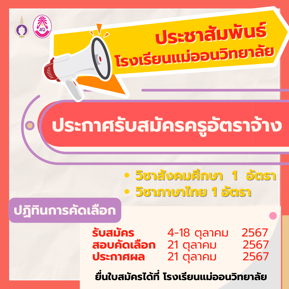 ประกาศรับสมัครครูอัตราจ้างโรงเรียนแม่ออนวิทยาลัย