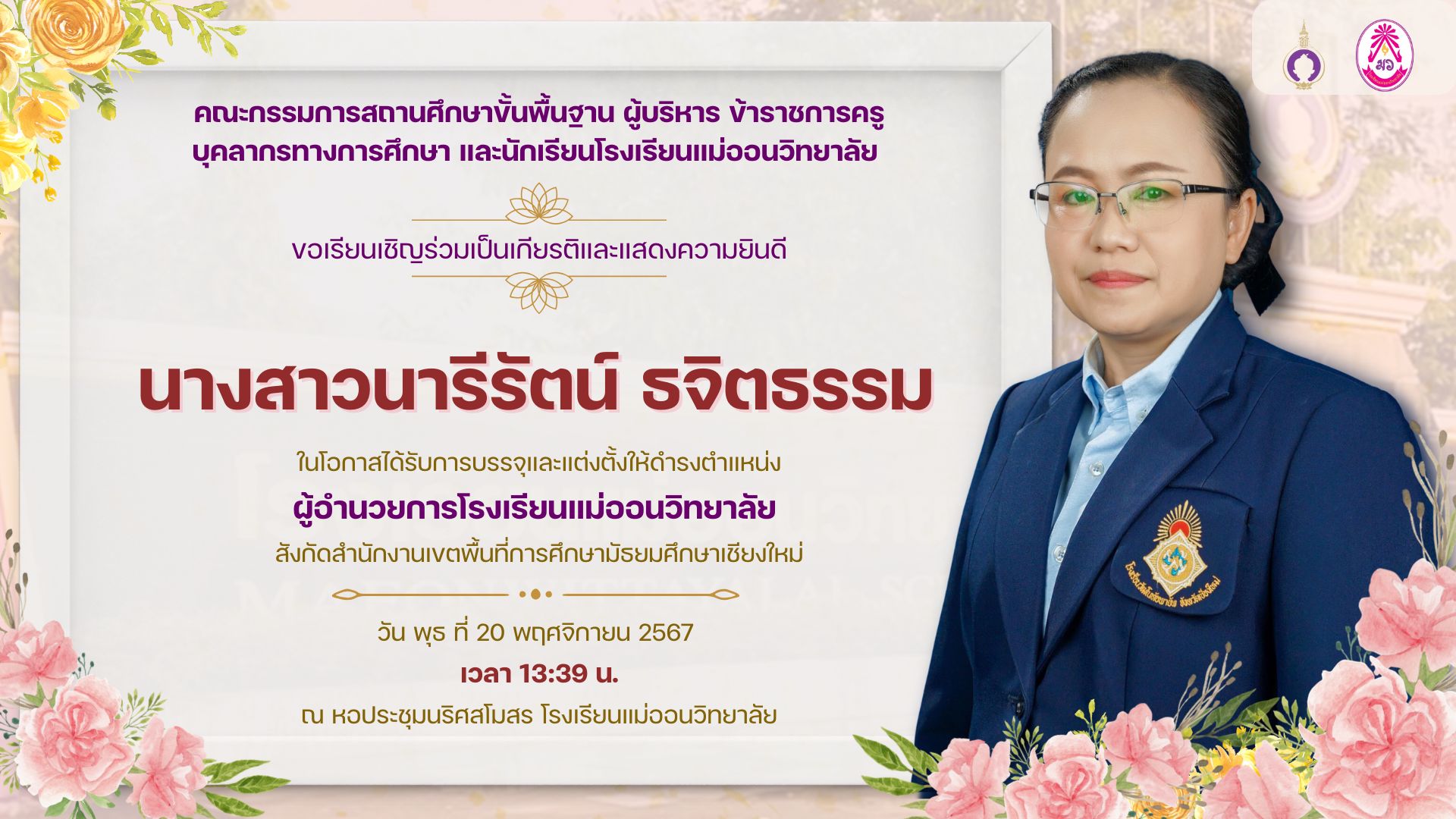 คณะกรรมการสถานศึกษาขั้นพื้นฐาน ผู้บริหาร ข้าราชการครู บุคลากรทางการศึกษา และนักเรียนโรงเรียนแม่ออนวิทยาลัย ขอเรียนเชิญร่วมเป็นเกียรติและแสดงความยินดี