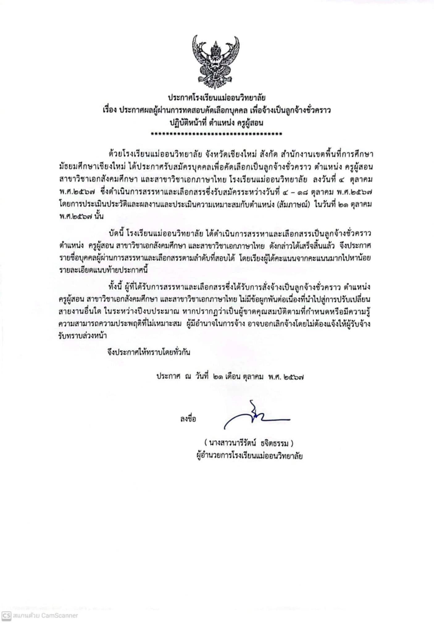 ประกาศโรงเรียนแม่ออนวิทยาลัย เรื่อง ประกาศผลผู้ผ่านการทดสอบคัดเลือกบุคคล เพื่อจ้างเป็นลูกจ้างชั่วคราวปฏิบัติหน้าที่ ครูผู้สอน สาขาวิชาเอกสังคมศึกษา