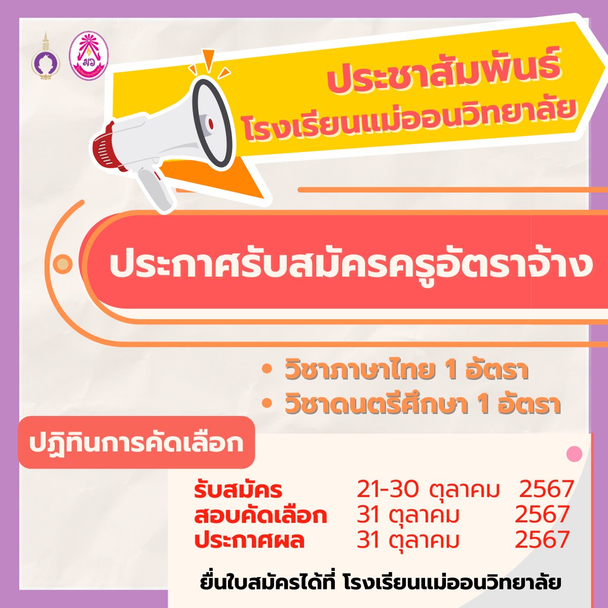 ประชาสัมพันธ์ โรงเรียนแม่ออนวิทยาลัย เรื่อง รับสมัครครูอัตราจ้าง