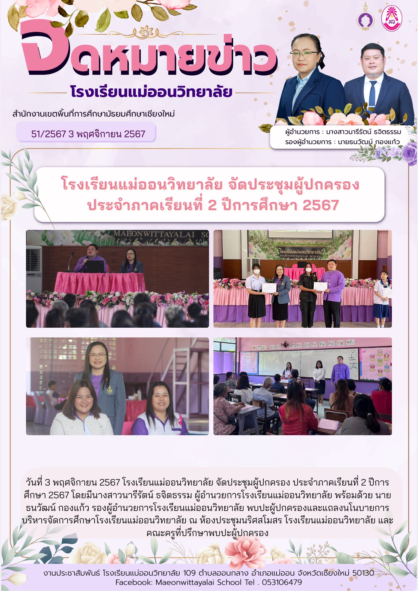 วันที่ 3 พฤศจิกายน 2567 โรงเรียนแม่ออนวิทยาลัย จัดประชุมผู้ปกครอง ประจำภาคเรียนที่ 2 ปีการศึกษา 2567 โดยมีนางสาวนารีรัตน์ ธจิตธรรม ผู้อำนวยการโรงเรียนแม่ออนวิทยาลัย พร้อมด้วย นายธนวัฒน์ กองแก้ว รองผู้อำนวยการโรงเรียนแม่ออนวิทยาลัย พบปะผู้ปกครองและแถลงนโนบายการบริหารจัดการศึกษาโรงเรียนแม่ออนวิทยาลัย ณ ห้องประชุมนริศสโมสร โรงเรียนแม่ออนวิทยาลัย และคณะครูที่ปรึกษาพบปะผู้ปกครอง