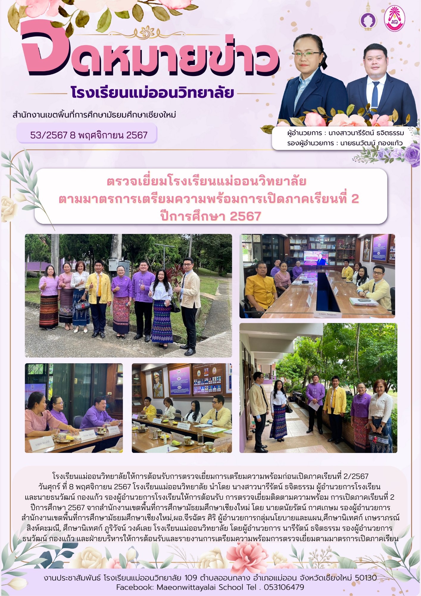 วันศุกร์ ที่ 8 พฤศจิกายน 2567 โรงเรียนแม่ออนวิทยาลัย นำโดย นางสาวนารีรัตน์ ธจิตธรรม ผู้อำนวยการโรงเรียน และนายธนวัฒน์ กองแก้ว รองผู้อำนวยการโรงเรียนให้การต้อนรับ การตรวจเยี่ยมติดตามความพร้อม การเปิดภาคเรียนที่ 2 ปีการศึกษา 2567 จากสำนักงานเขตพื้นที่การศึกษามัธยมศึกษาเชียงใหม่ โดย นายดนัยรัตน์ กาศเกษม รองผู้อำนวยการสำนักงานเขตพื้นที่การศึกษามัธยมศึกษาเชียงใหม่,ผอ.จีรฉัตร ศิริ ผู้อำนวยการกลุ่มนโยบายและแผน,ศึกษานิเทศก์ เกษราภรณ์ สิงห์คะมณี, ศึกษานิเทศก์ ภูริวัจน์ วงค์เลย โรงเรียนแม่ออนวิทยาลัย โดยผู้อำนวยการ นารีรัตน์ ธจิตธรรม รองผู้อำนวยการ ธนวัฒน์ กองแก้ว และฝ่ายบริหารให้การต้อนรับและรายงานการเตรียมความพร้อมการตรวจเยี่ยมตามมาตรการเปิดภาคเรียน