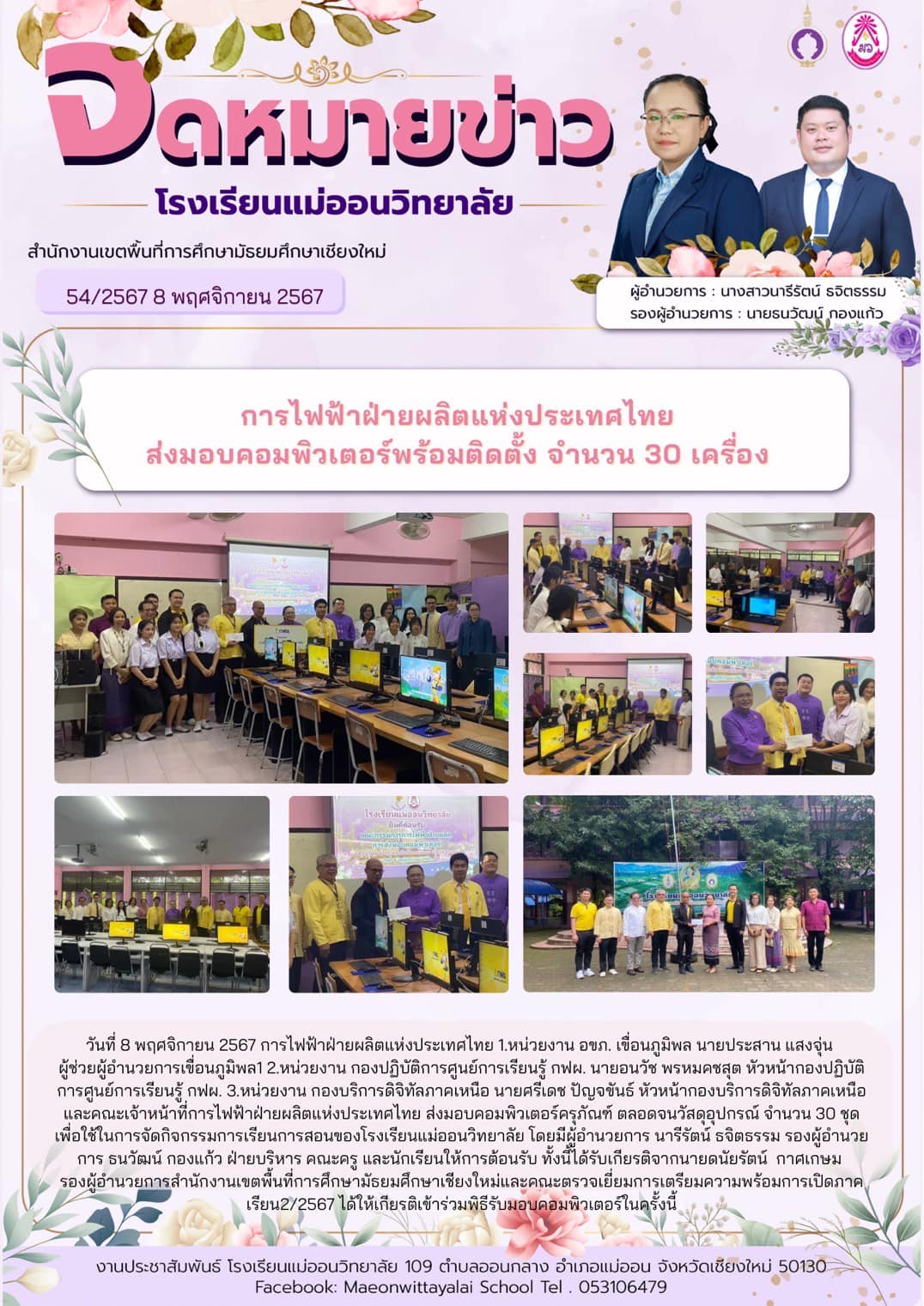 ผู้ช่วยผู้อำนวยการเขื่อนภูมิพล1 2.หน่วยงาน กองปฏิบัติการศูนย์การเรียนรู้ กฟผ. นายอนวัช พรหมคชสุต หัวหน้ากองปฏิบัติการศูนย์การเรียนรู้ กฟผ. 3.หน่วยงาน กองบริการดิจิทัลภาคเหนือ นายศรีเดช ปัญจขันธ์ หัวหน้ากองบริการดิจิทัลภาคเหนือ และคณะเจ้าหน้าที่การไฟฟ้าฝ่ายผลิตแห่งประเทศไทย ส่งมอบคอมพิวเตอร์ครุภัณฑ์ ตลอดจนวัสดุอุปกรณ์ จำนวน 30 ชุด เพื่อใช้ในการจัดกิจกรรมการเรียนการสอนของโรงเรียนแม่ออนวิทยาลัย โดยมีผู้อำนวยการ นารีรัตน์ ธจิตธรรม รองผู้อำนวยการ ธนวัฒน์ กองแก้ว ฝ่ายบริหาร คณะครู และนักเรียนให้การต้อนรับ ทั้งนี้ได้รับเกียรติจากนายดนัยรัตน์ กาศเกษม รองผู้อำนวยการสำนักงานเขตพื้นที่การศึกษามัธยมศึกษาเชียงใหม่และคณะตรวจเยี่ยมการเตรียมความพร้อมการเปิดภาคเรียน2/2566 ได้ให้เกียรติเข้าร่วมพิธีรับมอบคอมพิวเตอร์ในครั้งนี้