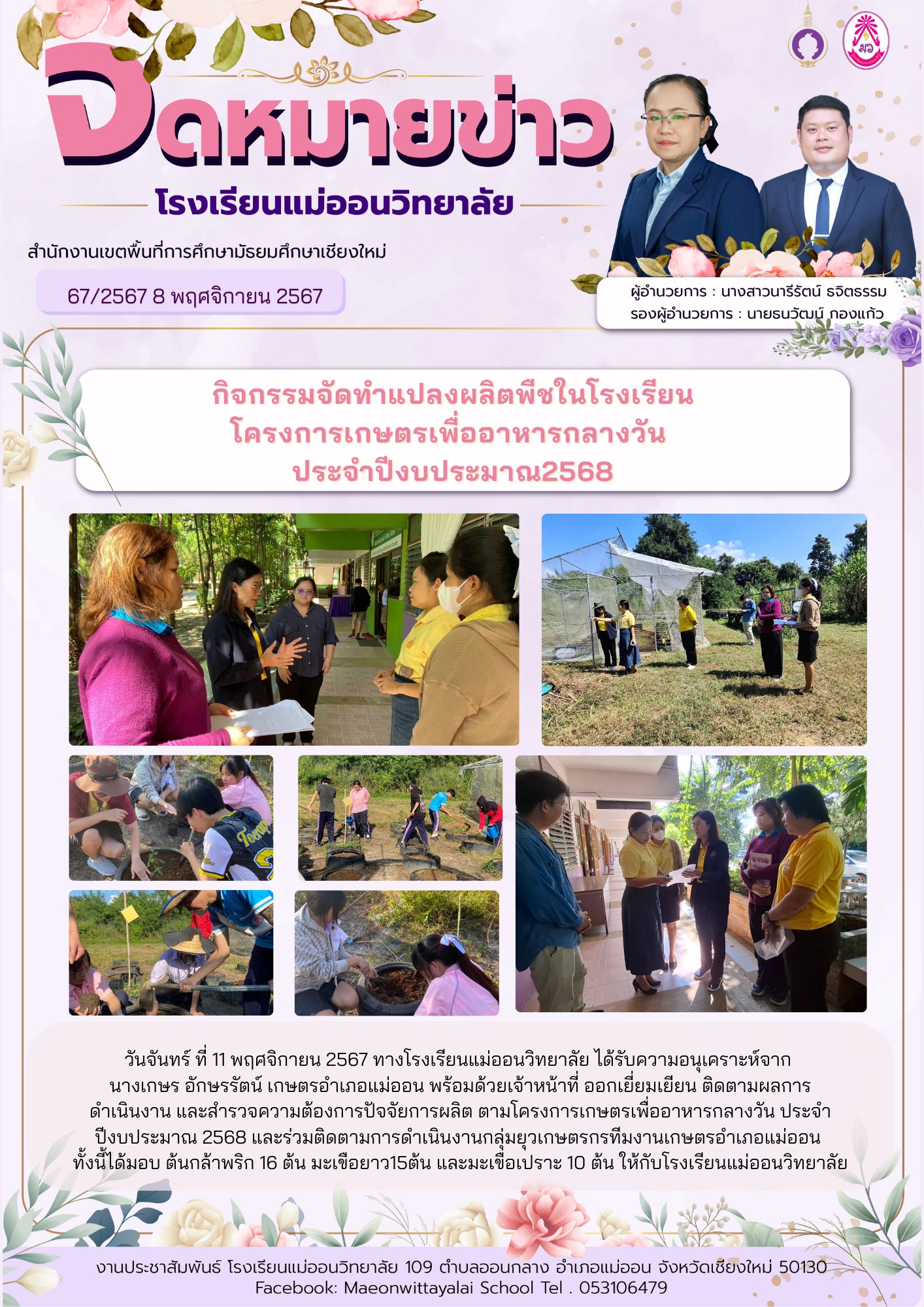 ทางโรงเรียนแม่ออนวิทยาลัย ได้รับความอนุเคราะห์จาก นางเกษร อักษรรัตน์ เกษตรอำเภอแม่ออน พร้อมด้วยเจ้าหน้าที่ ออกเยี่ยมเยียน ติดตามผลการดำเนินงาน และสำรวจความต้องการปัจจัยการผลิต ตามโครงการเกษตรเพื่ออาหา