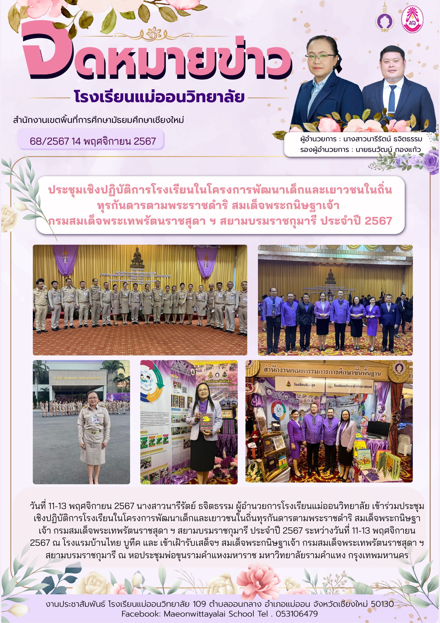 วันที่ 11-13 พฤศจิกายน 2567 นางสาวนารีรัตย์ ธจิตธรรม ผู้อำนวยการโรงเรียนแม่ออนวิทยาลัย เข้าร่วมประชุมเชิงปฏิบัติการโรงเรียนในโครงการพัฒนาเด็กและเยาวชนในถิ่นทุรกันดารตามพระราชดำริ สมเด็จพระกนิษฐาเจ้า กรมสมเด็จพระเทพรัตนราชสุดา ฯ สยามบรมราชกุมารี ประจำปี 2567 ระหว่างวันที่ 11-13 พฤศจิกายน 2567 ณ โรงแรมบ้านไทย บูทีค และ เข้าเฝ้ารับเสด็จฯ สมเด็จพระกนิษฐาเจ้า กรมสมเด็จพระเทพรัตนราชสุดา ฯ สยามบรมราชกุมารี ณ หอประชุมพ่อขุนรามคำแหงมหาราช มหาวิทยาลัยรามคำแหง กรุงเทพมหานคร
