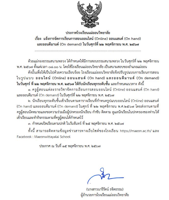 ประกาศโรงเรียนแม่ออนวิทยาลัย เรื่อง แจ้งการจัดการเรียนการสอนออนไลน์ (Online) ออนแฮนด์ (On hand)และออนดีมานด์ (On demand) ในวันศุกร์ที่ 22 พฤศจิกายน พ.ศ. 2567