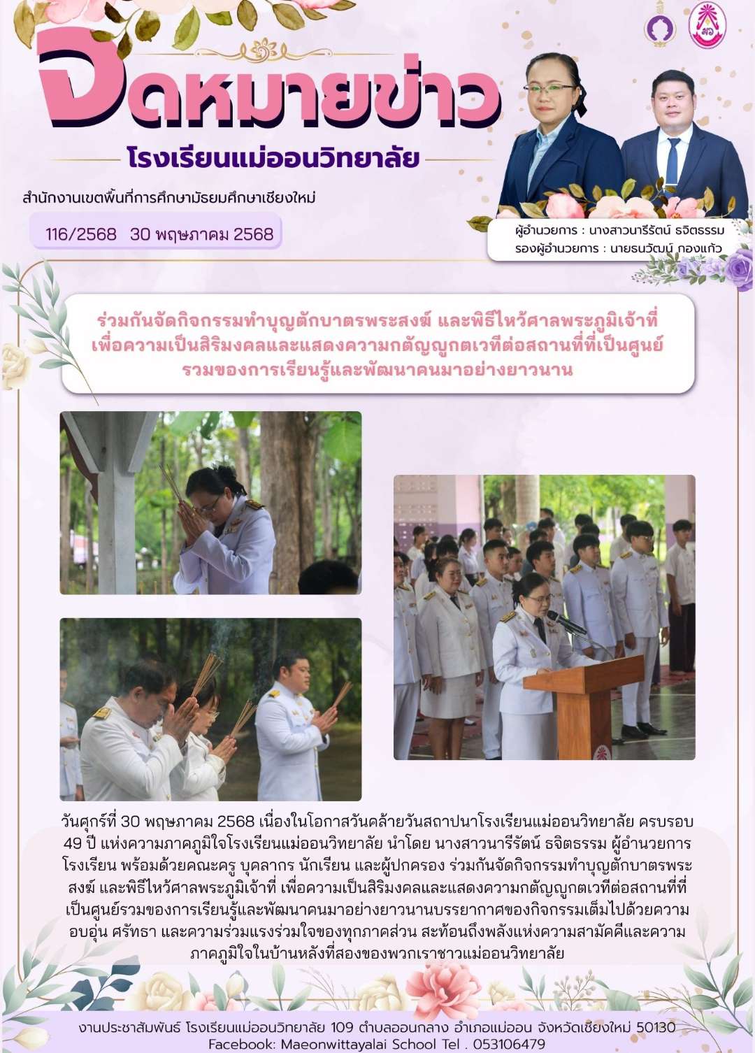ร่วมกันจัดกิจกรรมทำบุญตักบาตรพระสงฆ์ และพิธีไหว้ศาลพระภูมิเจ้าที่ เพื่อความเป็นสิริมงคลและแสดงความกตัญญูกตเวทีต่อสถานที่ที่เป็นศูนย์รวมของการเรียนรู้และพัฒนาคนมาอย่างยาวนาน