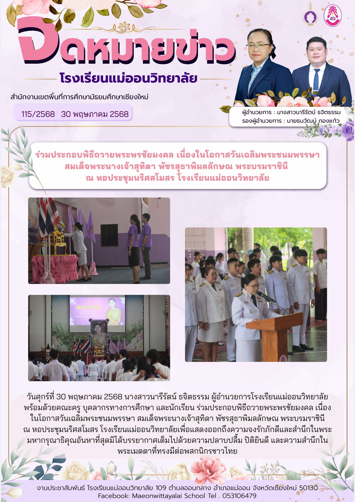 ร่วมประกอบพิธีถวายพระพรชัยมงคล เนื่องในโอกาสวันเฉลิมพระชนมพรรษา สมเด็จพระนางเจ้าสุทิดา พัชรสุธาพิมลลักษณ พระบรมราชินี ณ หอประชุมนริศสโมสร โรงเรียนแม่ออนวิทยาลัย