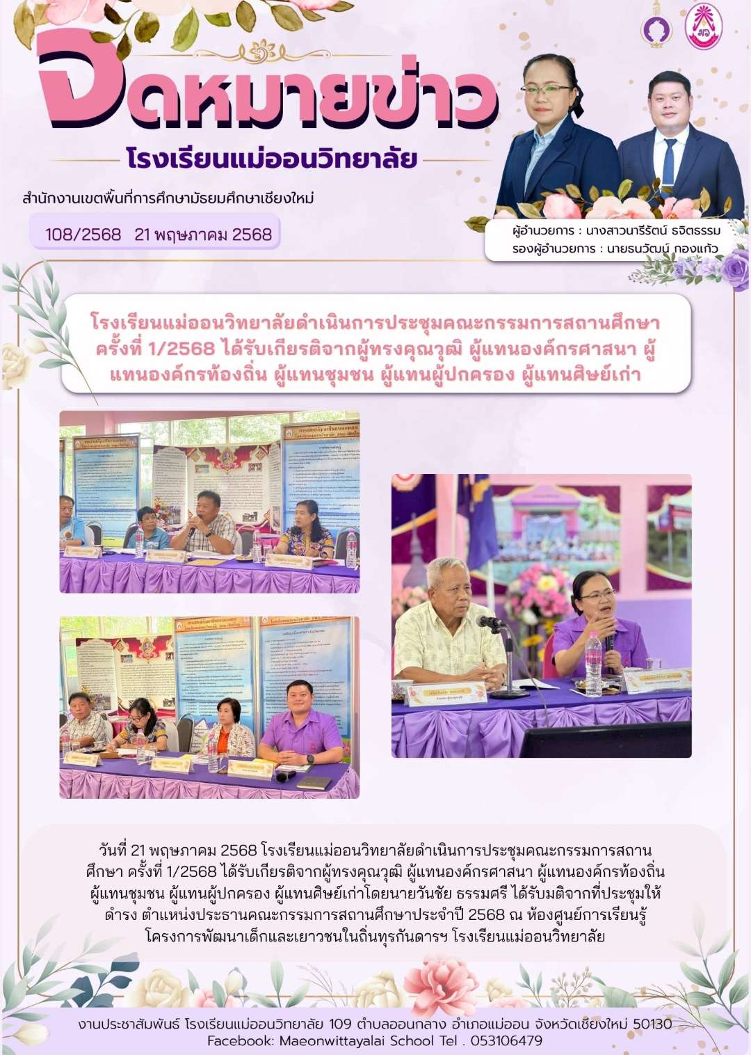 โรงเรียนแม่ออนวิทยาลัยดำเนินการประชุมคณะกรรมการสถานศึกษา ครั้งที่ 1/2568 ได้รับเกียรติจากผู้ทรงคุณวุฒิ ผู้แทนองค์กรศาสนา ผู้แทนองค์กรท้องถิ่น ผู้แทนชุมชน ผู้แทนผู้ปกครอง ผู้แทนศิษย์เก่า