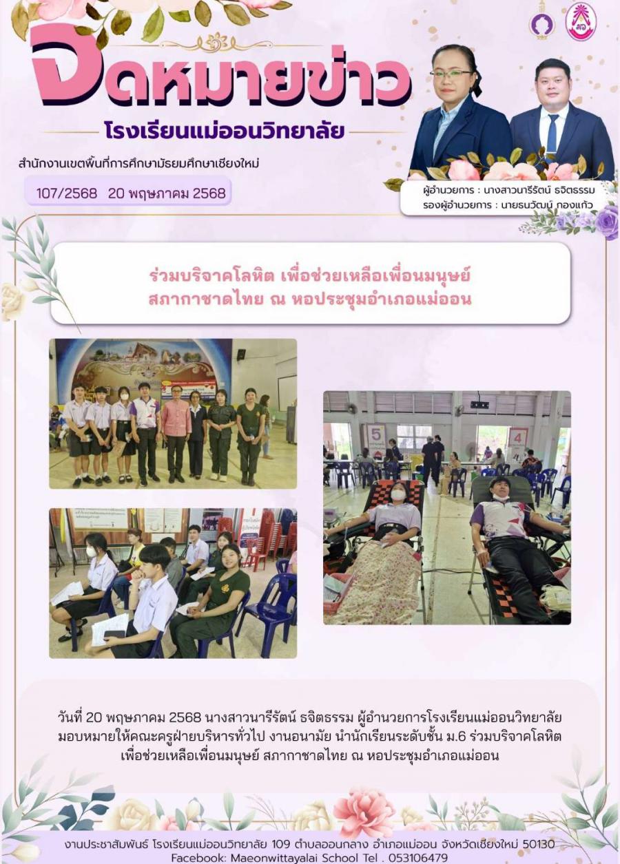 ร่วมบริจาคโลหิต เพื่อช่วยเหลือเพื่อนมนุษย์ สภากาชาดไทย ณ หอประชุมอำเภอแม่ออน