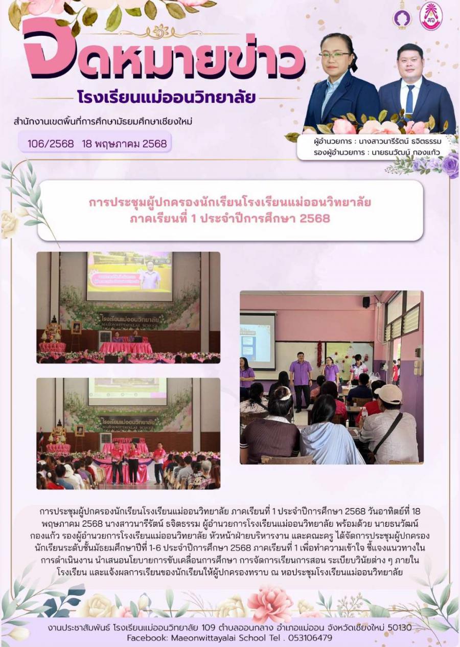 การประชุมผู้ปกครองนักเรียนโรงเรียนแม่ออนวิทยาลัย ภาคเรียนที่ 1 ประจำปีการศึกษา 2568
