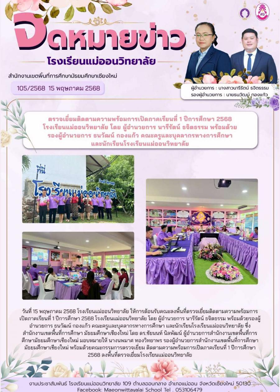 ตรวจเยี่ยมติดตามความพร้อมการเปิดภาคเรียนที่ 1 ปีการศึกษา 2568 โรงเรียนแม่ออนวิทยาลัย โดย ผู้อำนวยการ นารีรัตน์ ธจิตธรรม พร้อมด้วยรองผู้อำนวยการ ธนวัฒน์ กองแก้ว คณะครูและบุคลากรทางการศึกษา และนักเรียนโ
