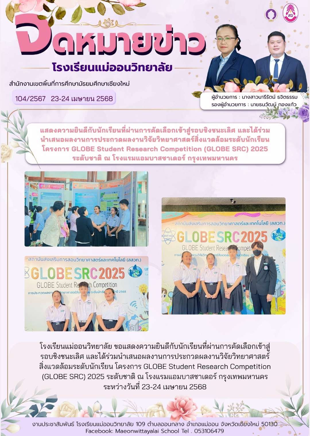 แสดงความยินดีกับนักเรียนที่ผ่านการคัดเลือกเข้าสู่รอบชิงชนะเลิศ และได้ร่วมนำเสนอผลงานการประกวดผลงานวิจัยวิทยาศาสตร์สิ่งแวดล้อมระดับนักเรียน โครงการ GLOBE Student Research Competition (GLOBE SRC) 2025 ร