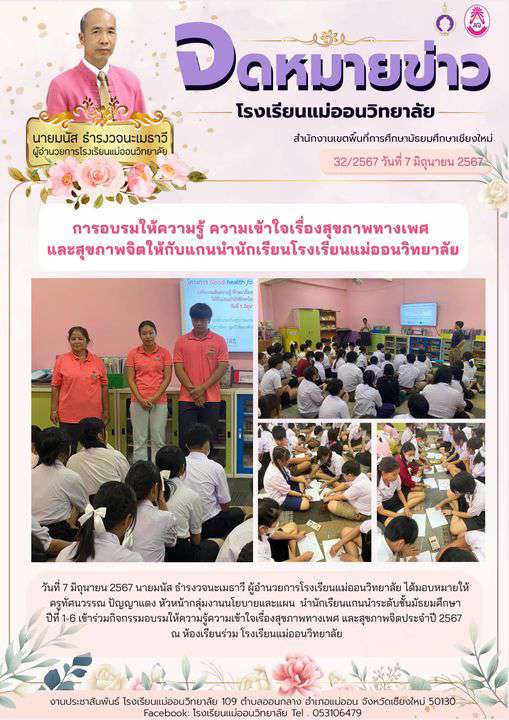 การอบรมให้ความรู้ ความเข้าใจเรื่องสุขภาพทางเพศและสุขภาพจิตให้กับแกนนำนักเรียนโรงเรียนแม่ออนวิทยาลัย