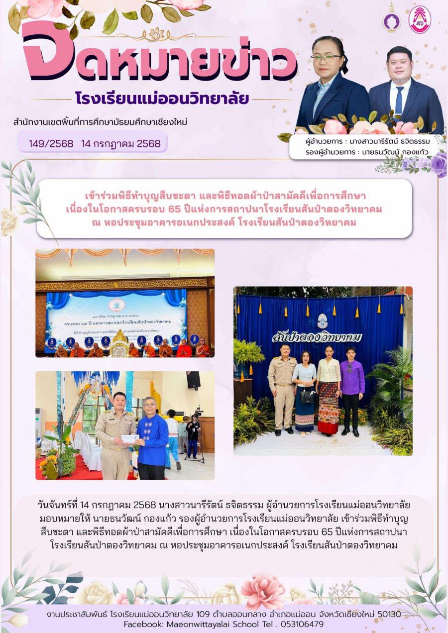 เข้าร่วมพิธีทำบุญสืบชะตา และพิธีทอดผ้าป่าสามัคคีเพื่อการศึกษา เนื่องในโอกาสครบรอบ 65 ปีแห่งการสถาปนาโรงเรียนสันป่าตองวิทยาคม