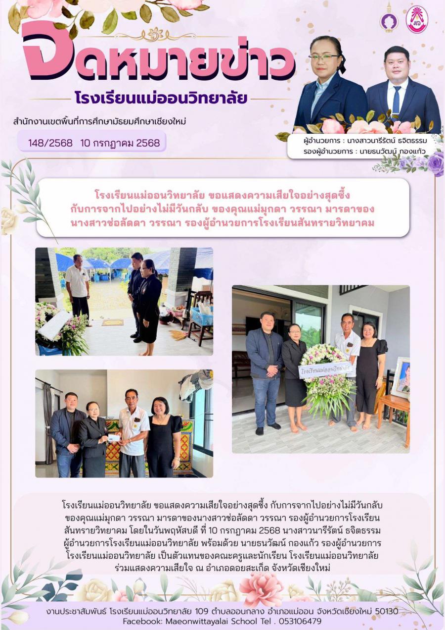 โรงเรียนแม่ออนวิทยาลัย ขอแสดงความเสียใจอย่างสุดซึ้ง กับการจากไปอย่างไม่มีวันกลับ ของคุณแม่มุกดา วรรณา มารดาของนางสาวช่อลัดดา วรรณา รองผู้อำนวยการโรงเรียนสันทรายวิทยาคม