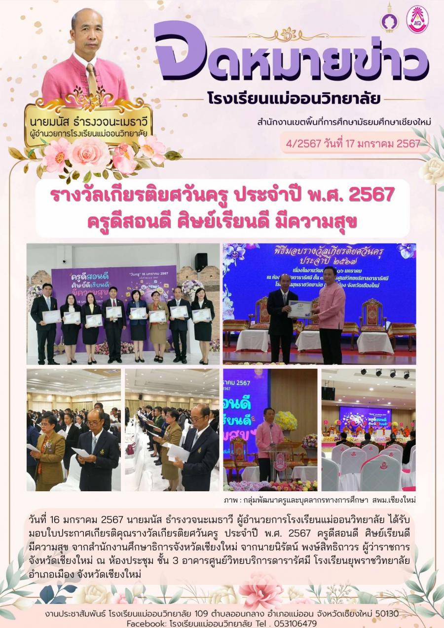 รางวัลเกียรติยศวันครู ประจำปี พ.ศ. 2567 ครูดีสอนดี ศิษย์เรียนดี มีความสุข