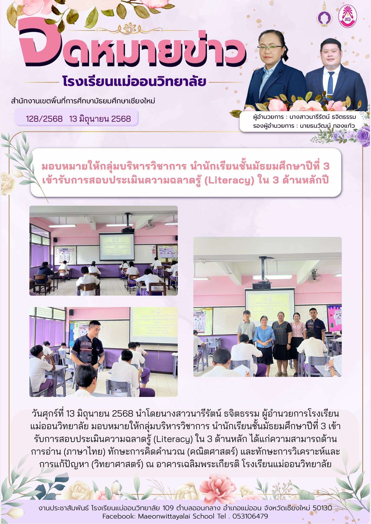 มอบหมายให้กลุ่มบริหารวิชาการ นำนักเรียนชั้นมัธยมศึกษาปีที่ 3 เข้ารับการสอบประเมินความฉลาดรู้ (Literacy) ใน 3 ด้านหลักปี